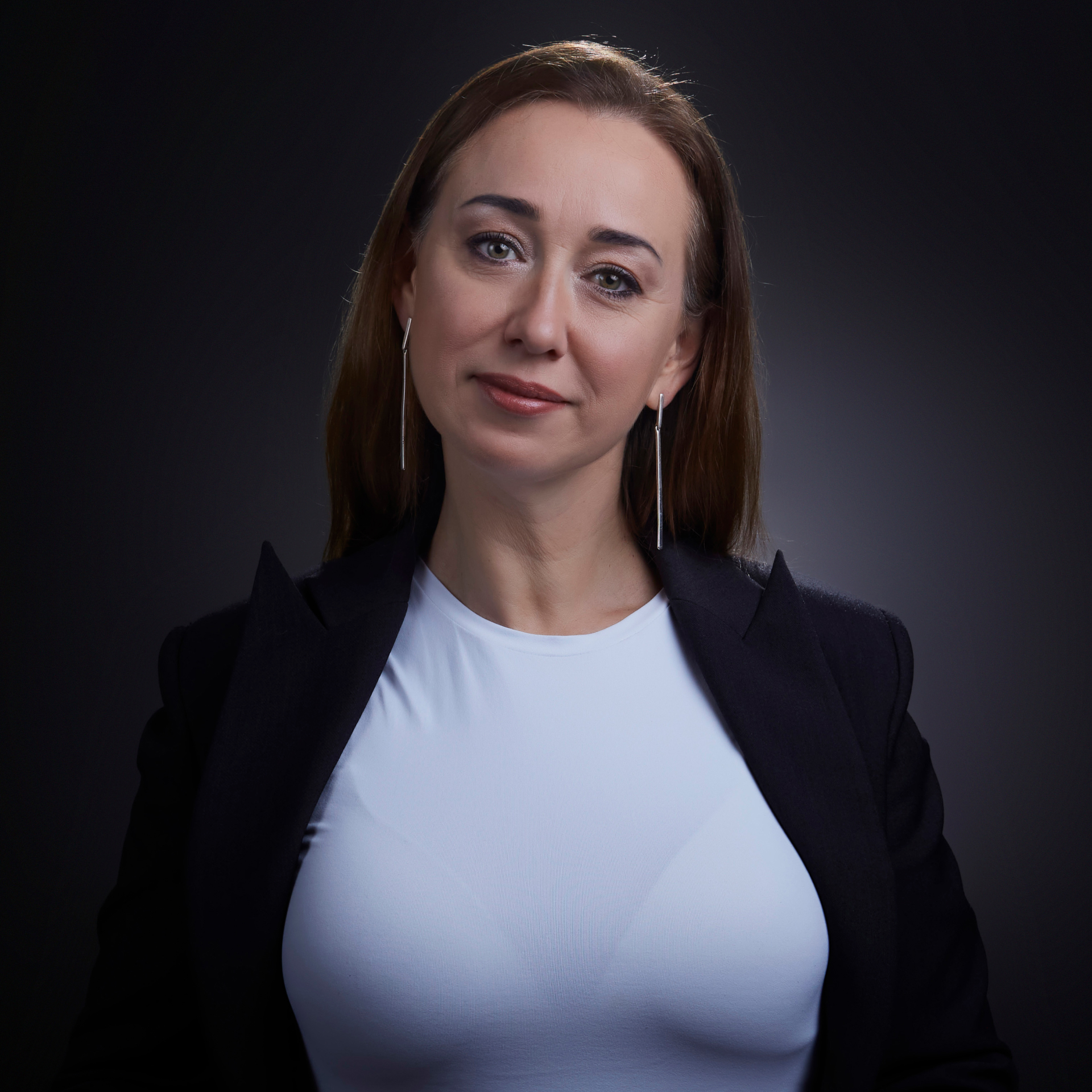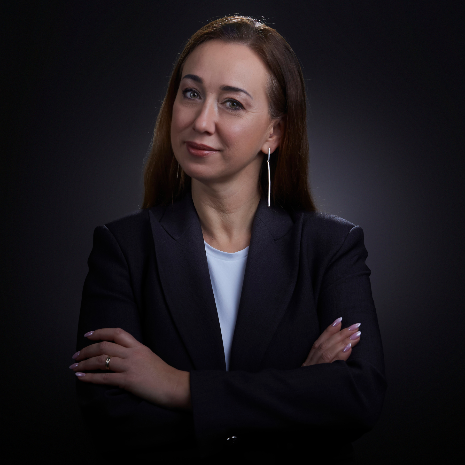 Milena’s portraits highlight her confidence, calmness, and professional approach to working with corporate clients. The use of a dark background and soft light achieved a refined effect of elegance and trust — values highly appreciated in business communication.