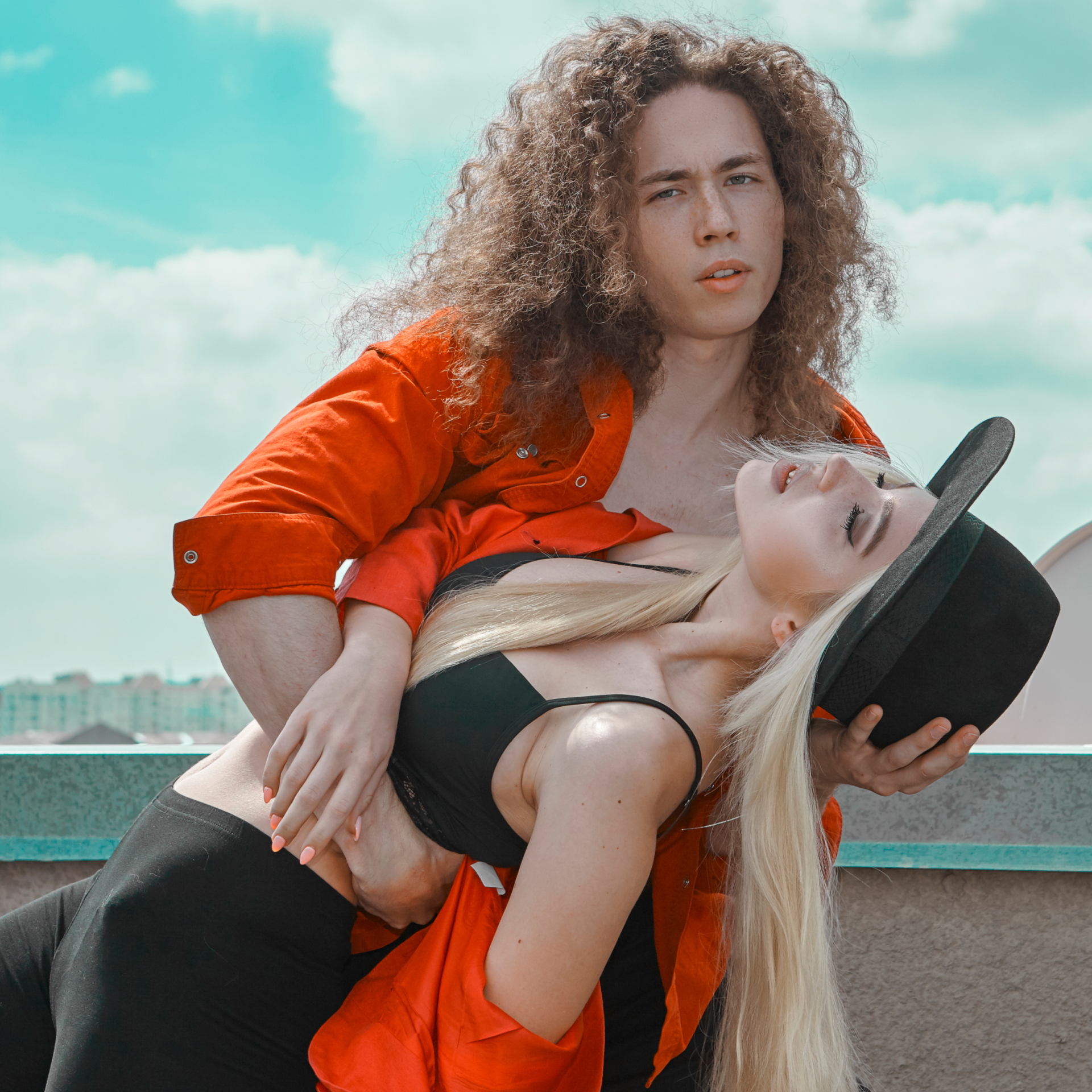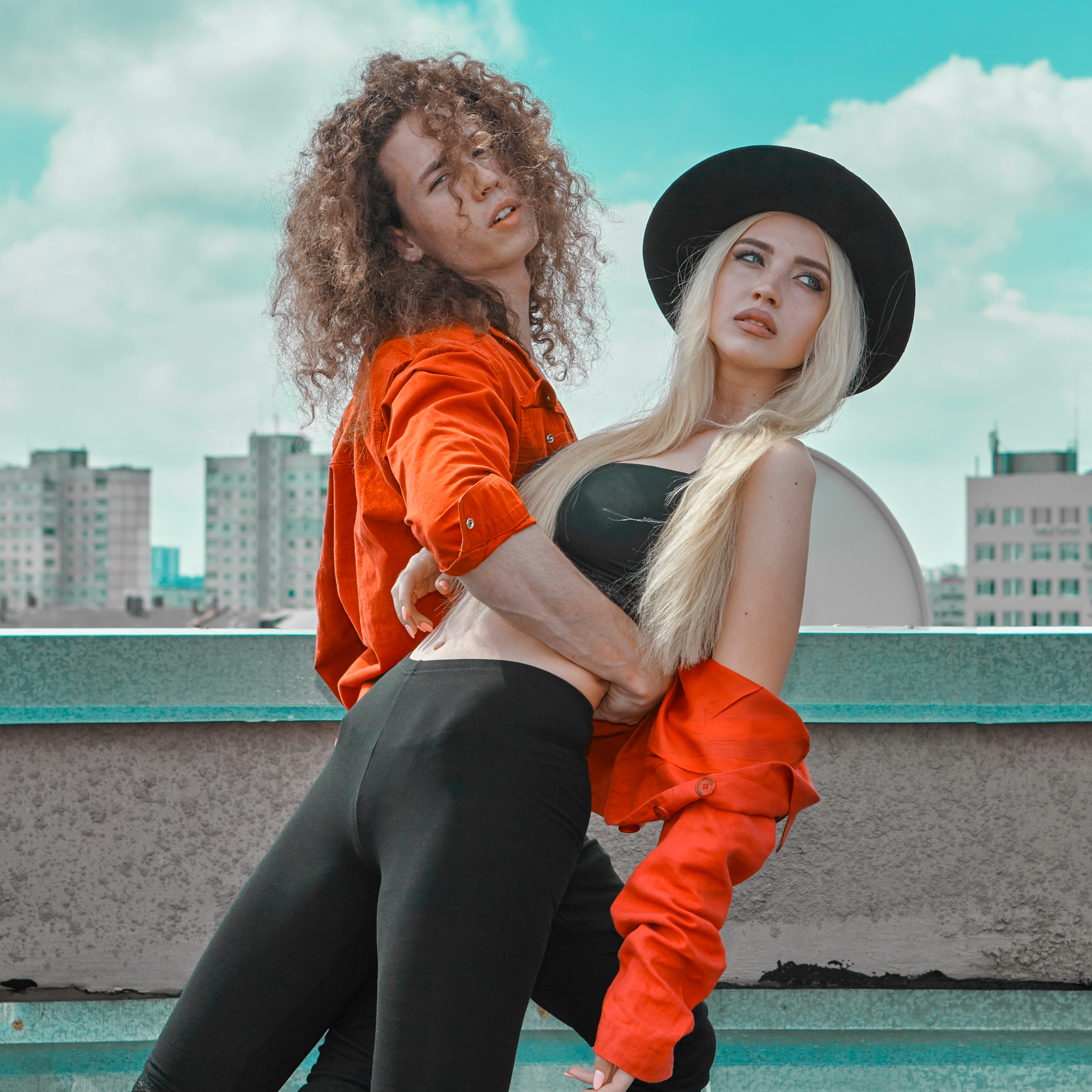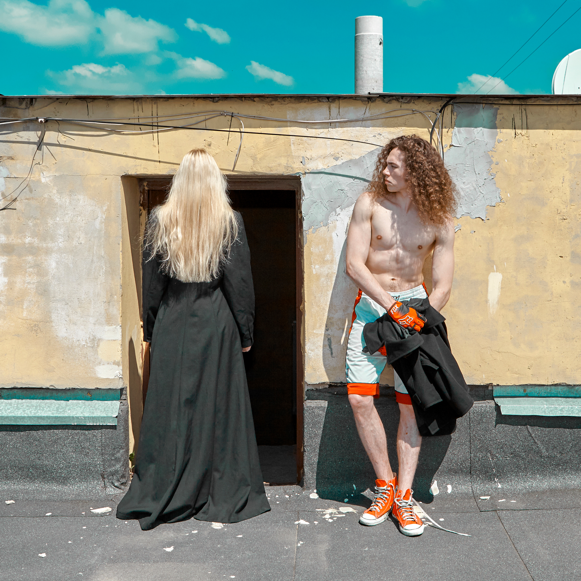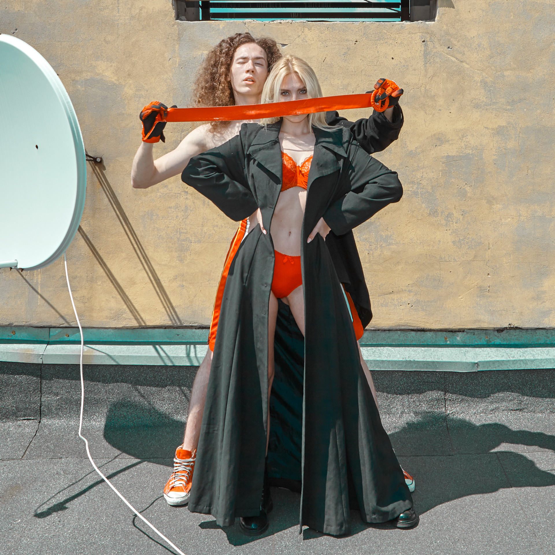 Modele pozują w stylizacjach inspirowanych kontrastem między surową architekturą miasta a wyrazistymi barwami i fakturami tkanin. Głównym motywem kolorystycznym jest ognisty pomarańcz, zestawiony z czernią i beżem — symbol pewności siebie i miejskiej elegancji.