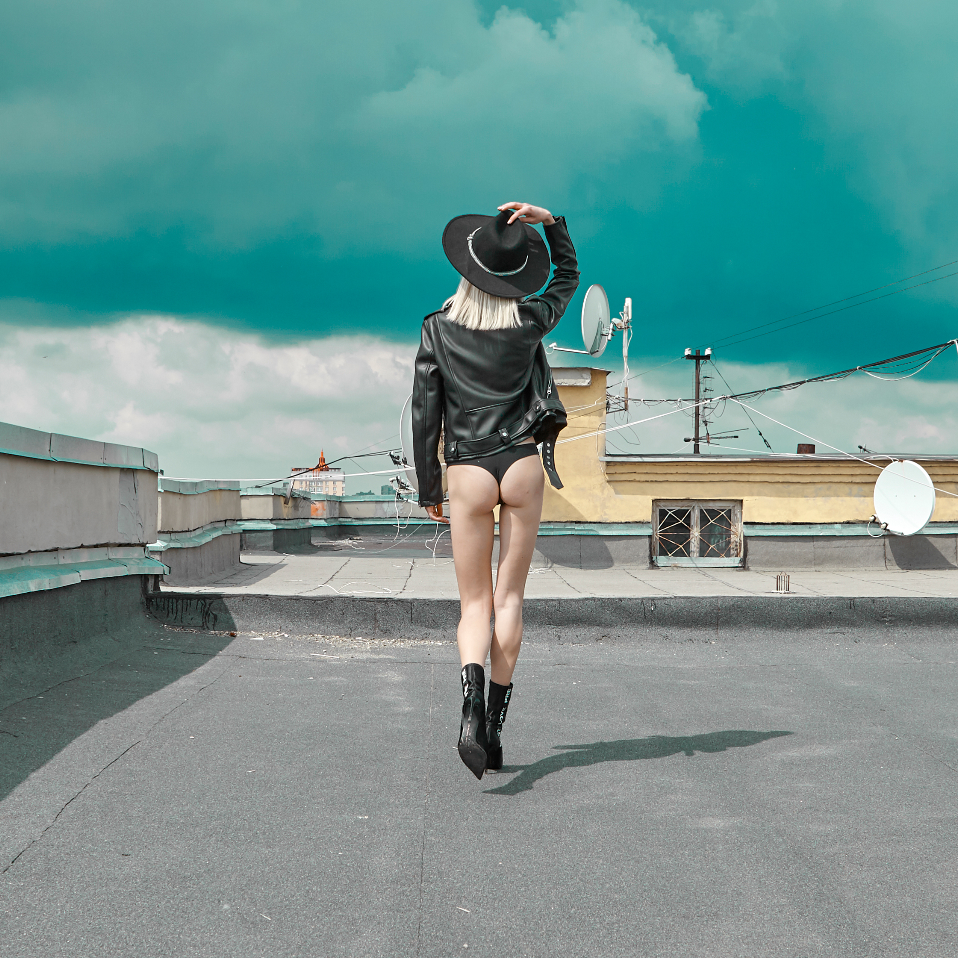 W sesji wykorzystano ubrania i dodatki od znanych marek. Czarne skórzane spodnie i kurtka z Zary nadają całości rockowego charakteru, a szerokie kapelusze Stradivarius wprowadzają modowy akcent typowy dla sesji editorialowych. Stylizację dopełniają buty Bershka, które nadają miejskiego, dynamicznego tonu oraz bielizna Lingerie Bloom, podkreślająca kobiecość i subtelną sensualność.