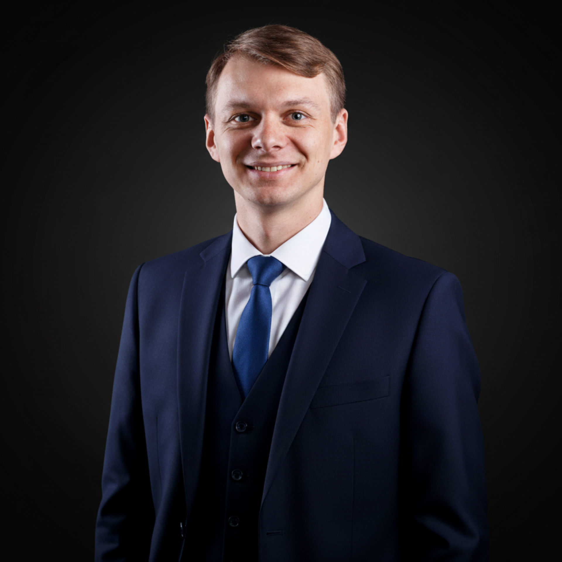 Zestawienie ciemnego tła z precyzyjnym modelowaniem światłem tworzy elegancki, minimalistyczny efekt wizualny, który świetnie sprawdza się w materiałach firmowych i oficjalnych profilach pracowniczych.