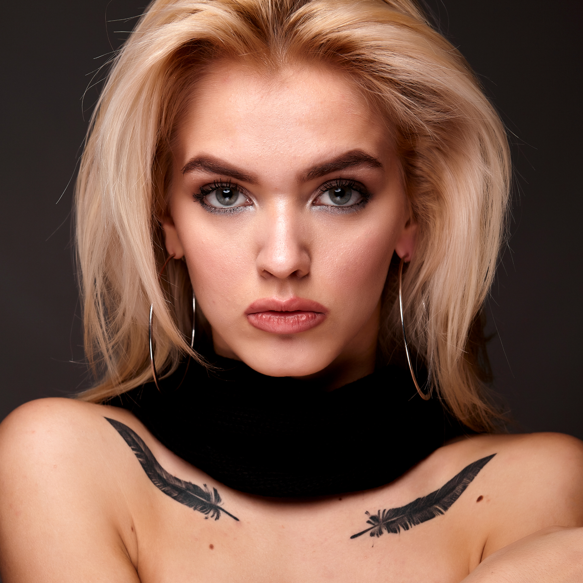 Makijaż i fryzura podkreślają naturalne piękno i charakter modelki, a prosta czarna stylizacja oraz delikatne tatuaże dodają całości charakteru. To połączenie subtelnej elegancji z naturalnym wdziękiem sprawia, że sesja zdjęciowa doskonale sprawdza się w magazynach modowych, kampaniach beauty oraz portfolio modelek.